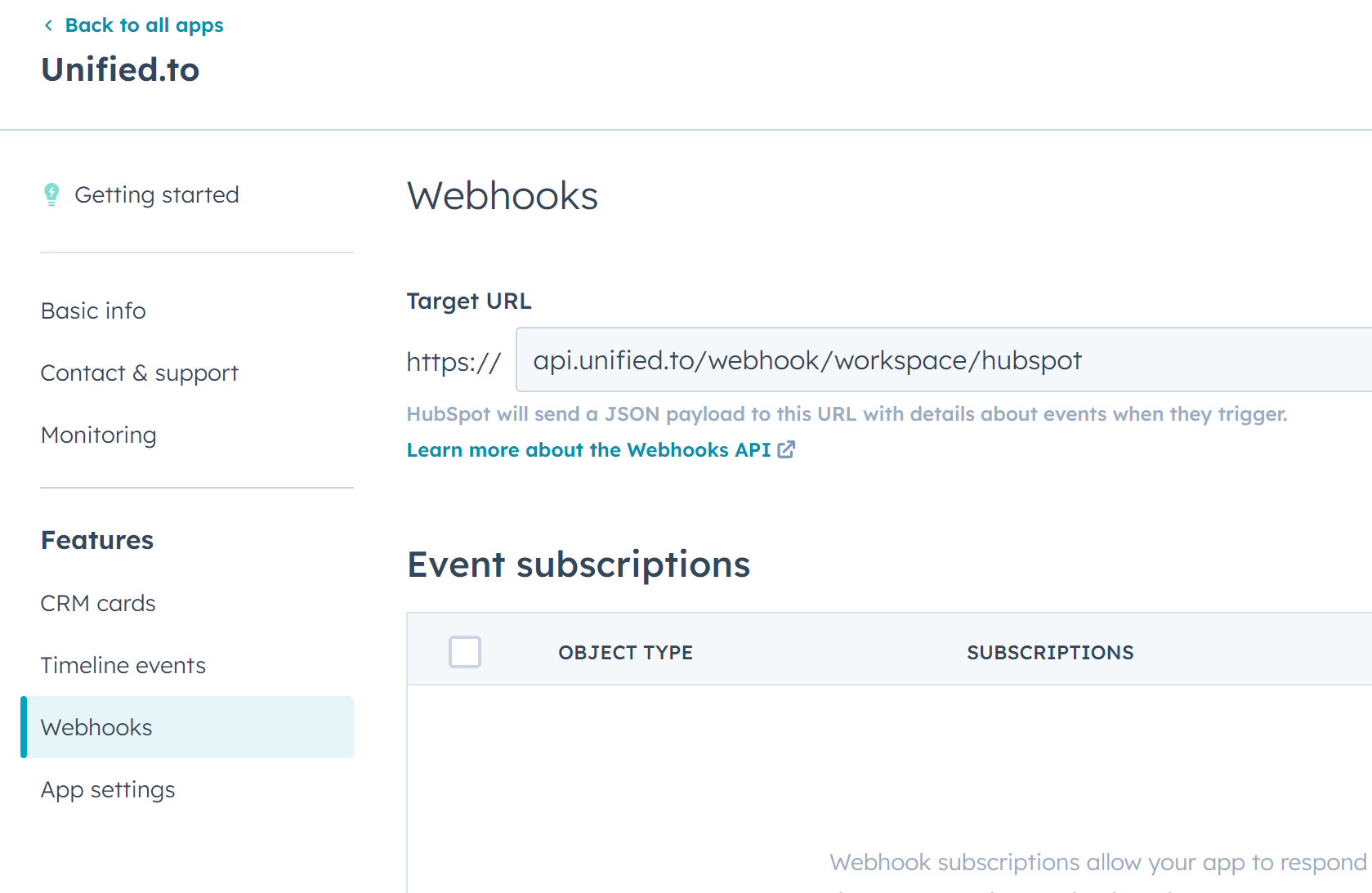 HubSpot uses a single webhook URL per app, which means you need to configure your app to send any events to the Unified.to servers.