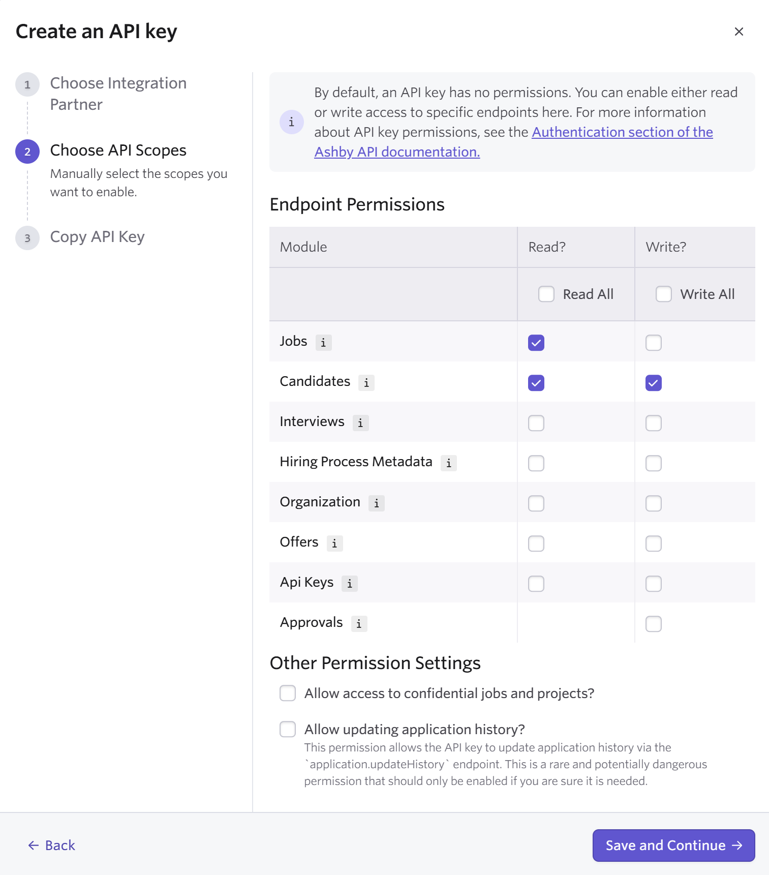 To use Webhooks, you will also need the "API Keys" WRITE permission. - Click "Save and Continue"