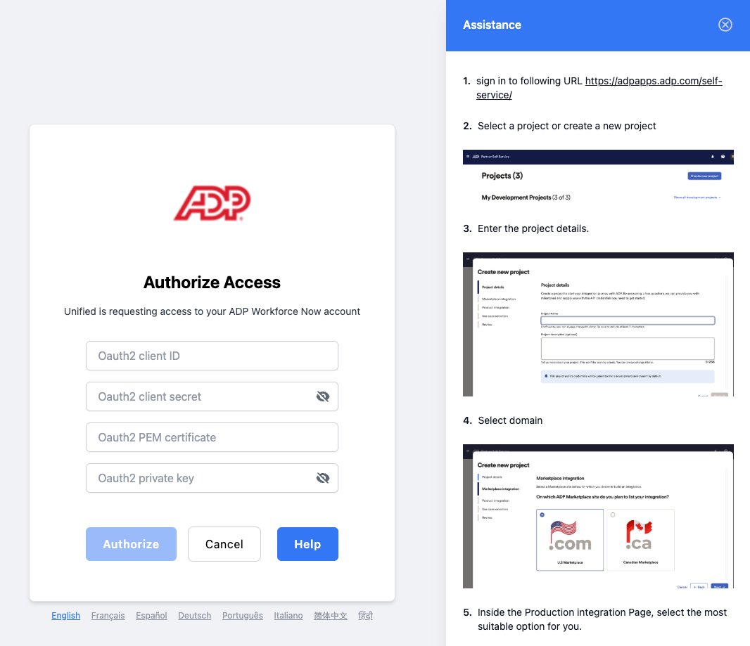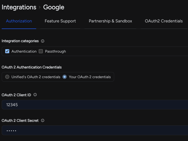 Our customers just input their application's OAuth2 client ID and client Secret obtained once from the provider. Unified also provides instructions on how to obtain those OAuth credentials.